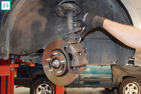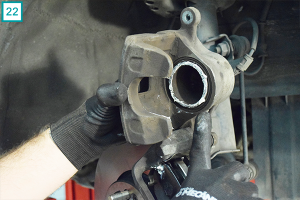 Passo 23: Coloque a pinça no cavalete e fixe-a com os parafusos. Faça o aperto com a chave 15 mm.
