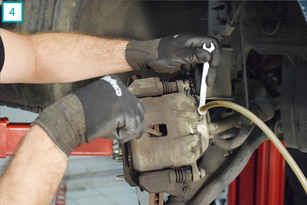 Passo 4: Abra o sangrador e retorne o êmbolo com o sargento. Utilize a chave 10 mm e solte o parafuso do sangrador