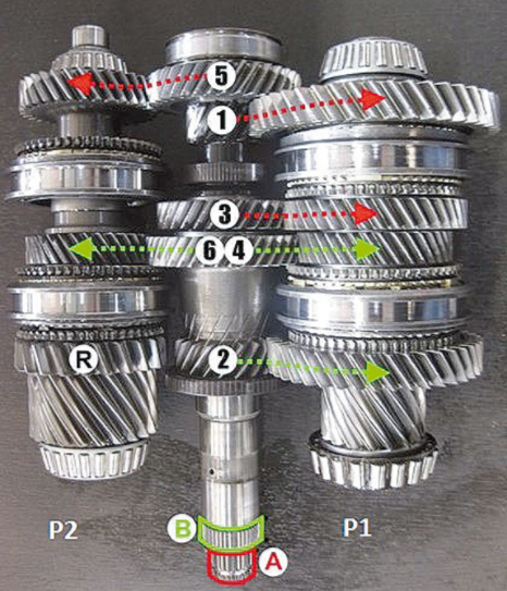 Em câmbios com dupla embreagem o sistema de transmissão é composto por duas árvores de transmissão, uma responsável pelas marchas pares e outra responsável pelas marchas ímpares.