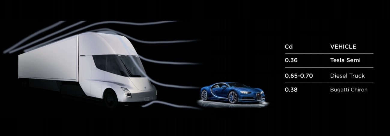 O Tesla Semi possui uma aerodinâmica futurística, com um coeficiente de arrasto ou também conhecido como coeficiente aerodinâmico (Cx) de 0.36, abaixo do superesportivo da Bugatti Chiron.