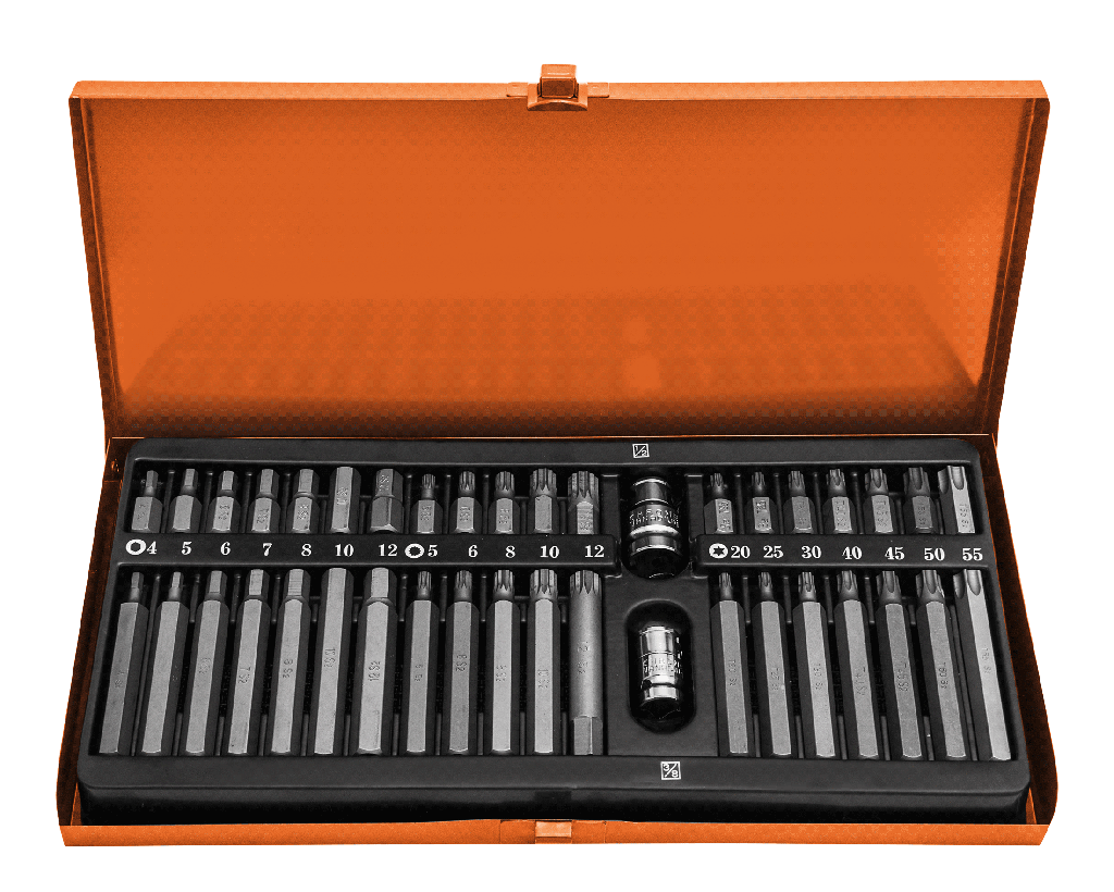 Para a fixação do parafuso do bujão com encaixe hexagonal e ponta multidentada, pode ser utilizado o jogo de ponteiras intercambiáveis com perfil longo que permitem fixar a ferramenta a lugares de difícil acesso.