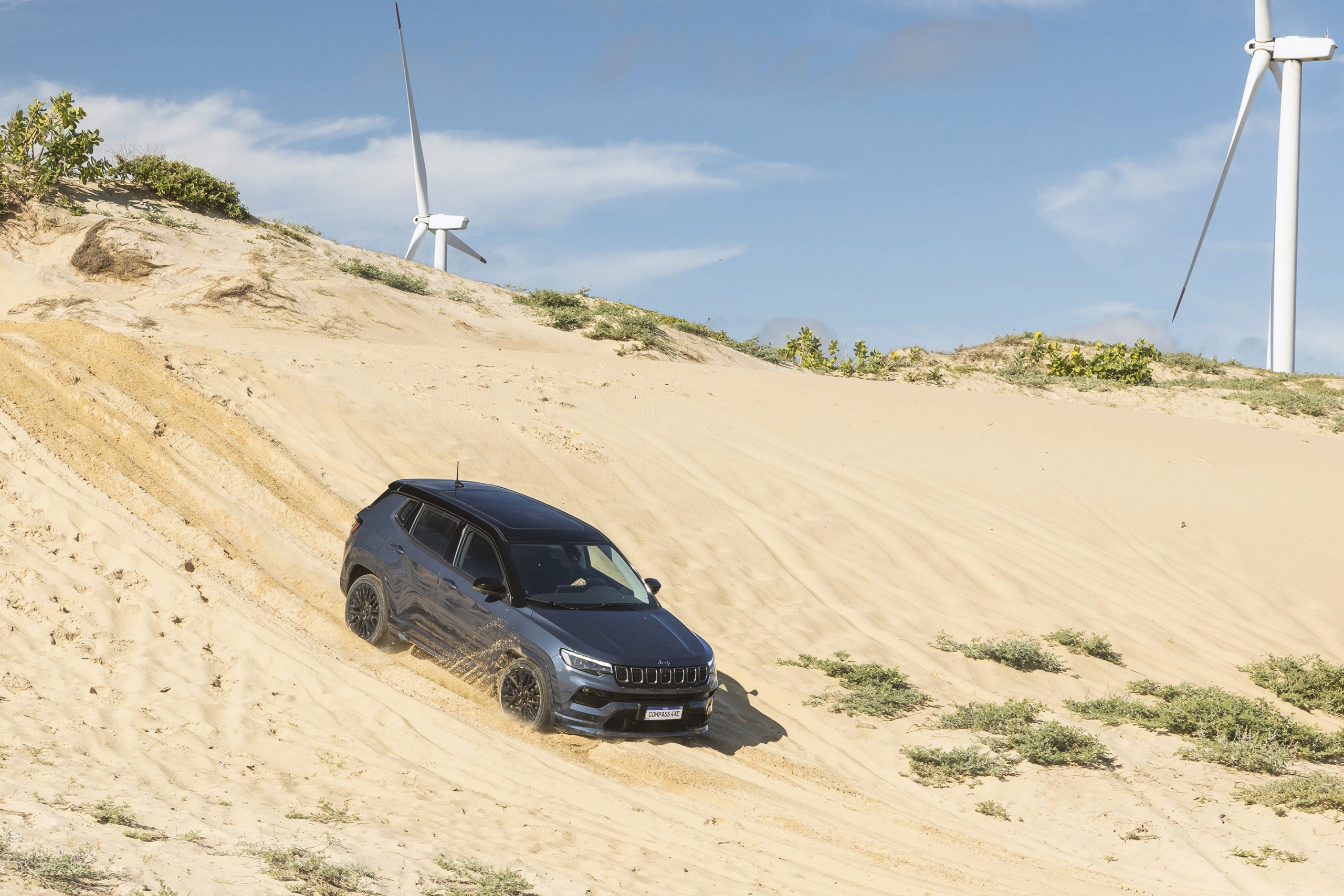 Apesar da neve ser algo raro no Brasil, o modo Snow é indicado para pisos com baixa aderência. O modo Sand/Mud é indicado para trilhas de estradas de terra ou areia. Em modo Sport, o Compass entrega toda a potência dos motores combinados em modo 4×4 e ajusta suspensão e direção. Além dos modos de condução padrão, o Compass possui seleção de modo 4WD Lock, 4WD Low e HDC (assistência para descidas).