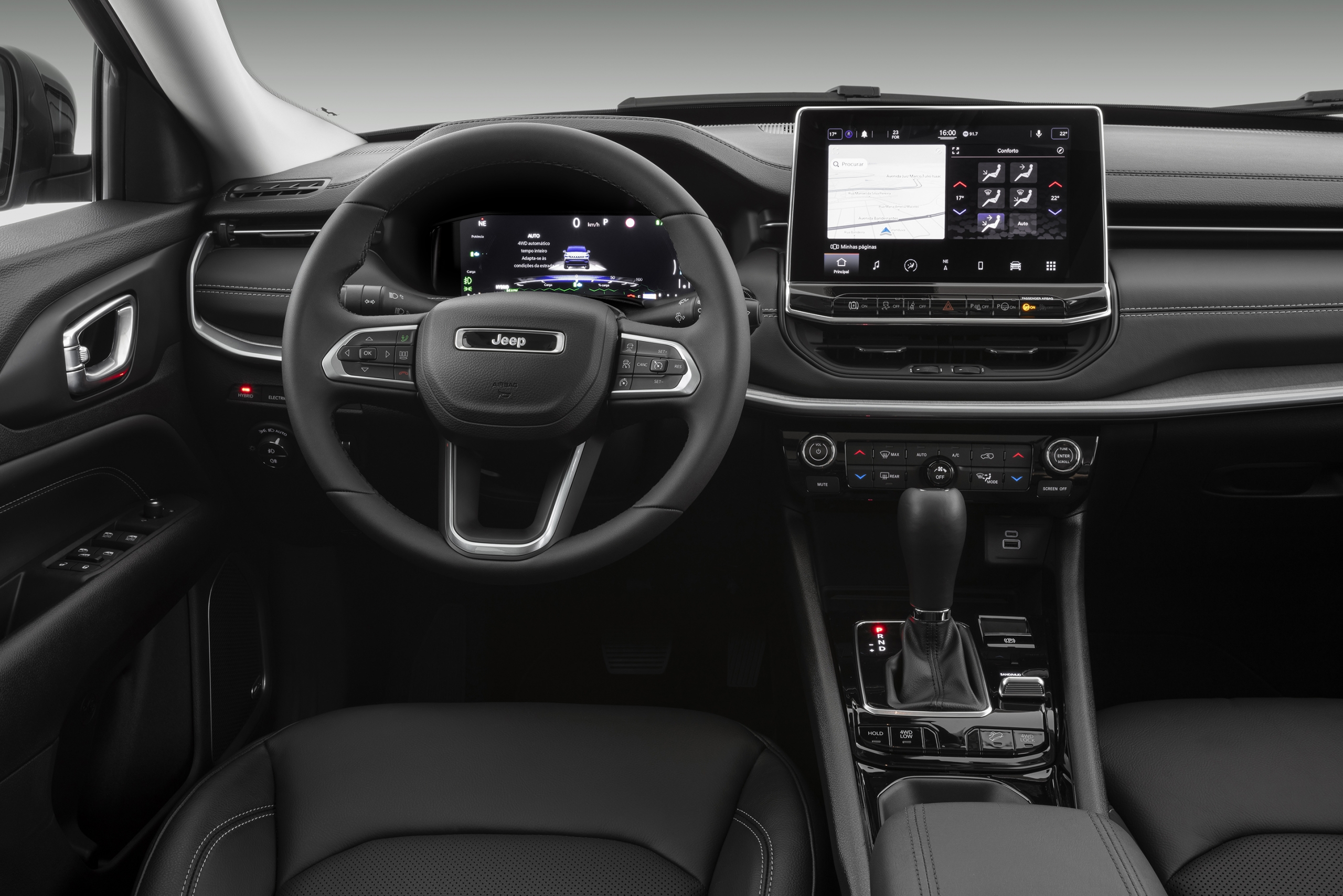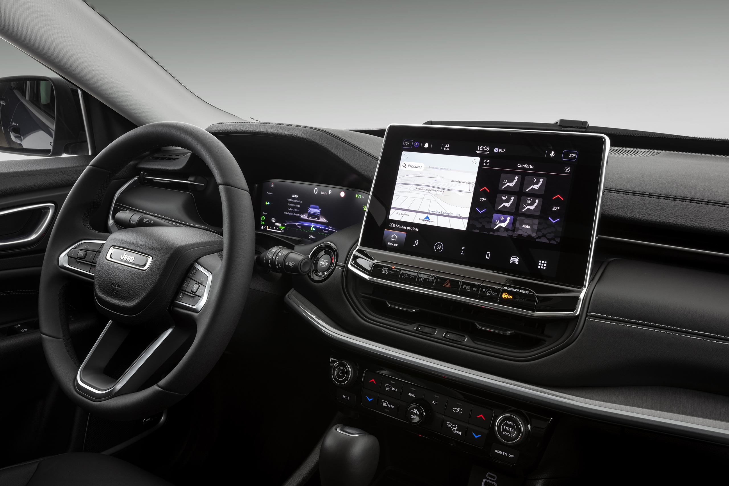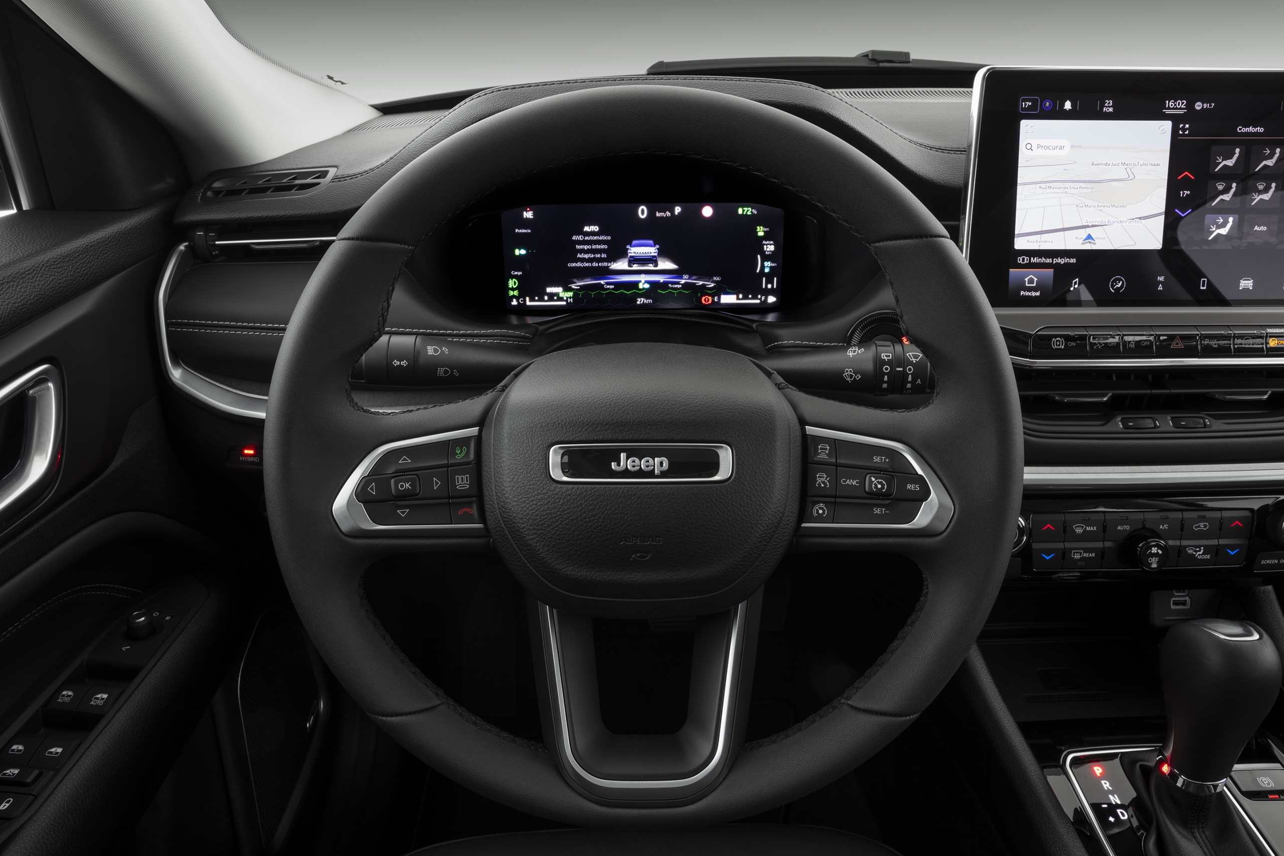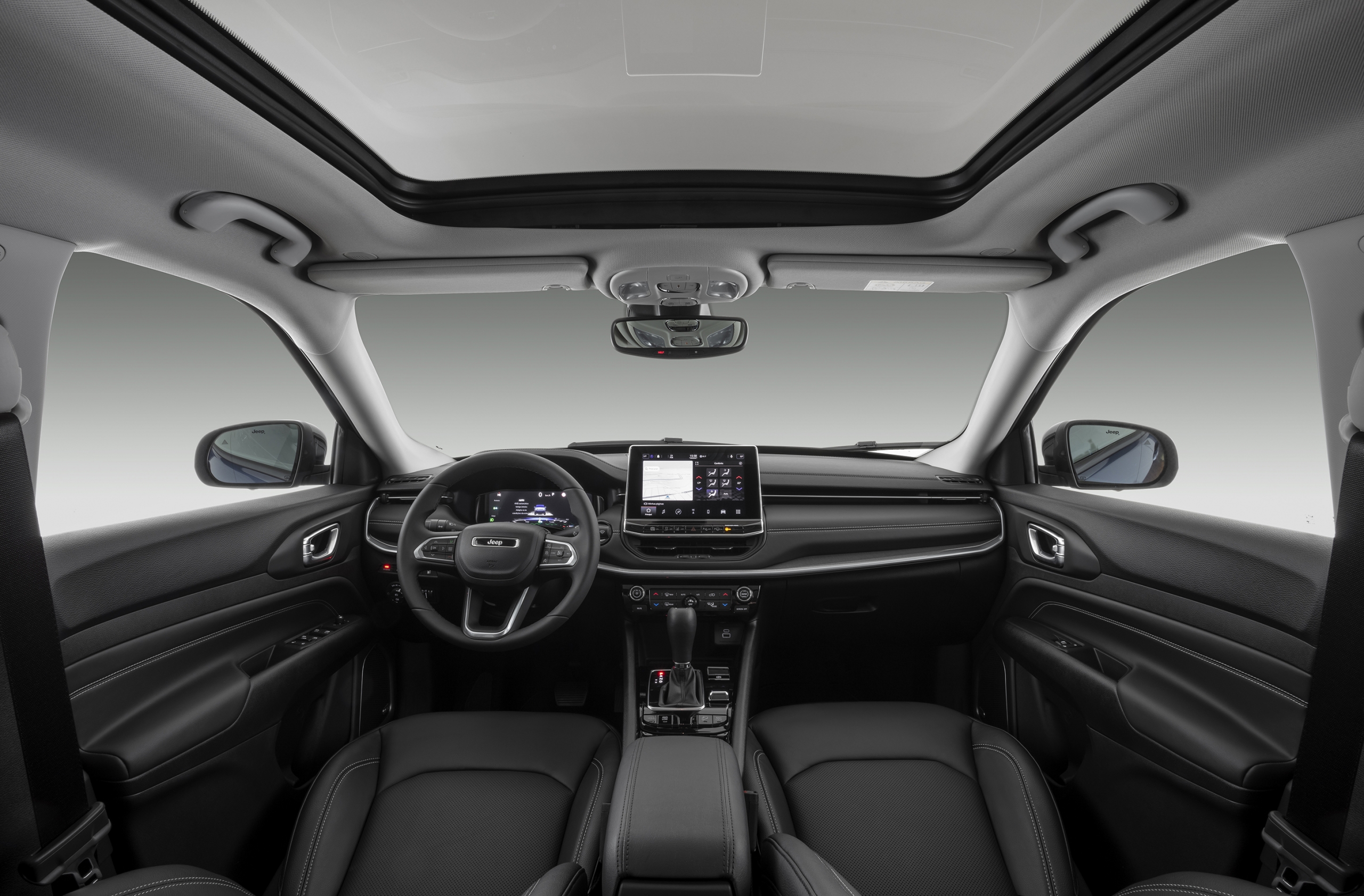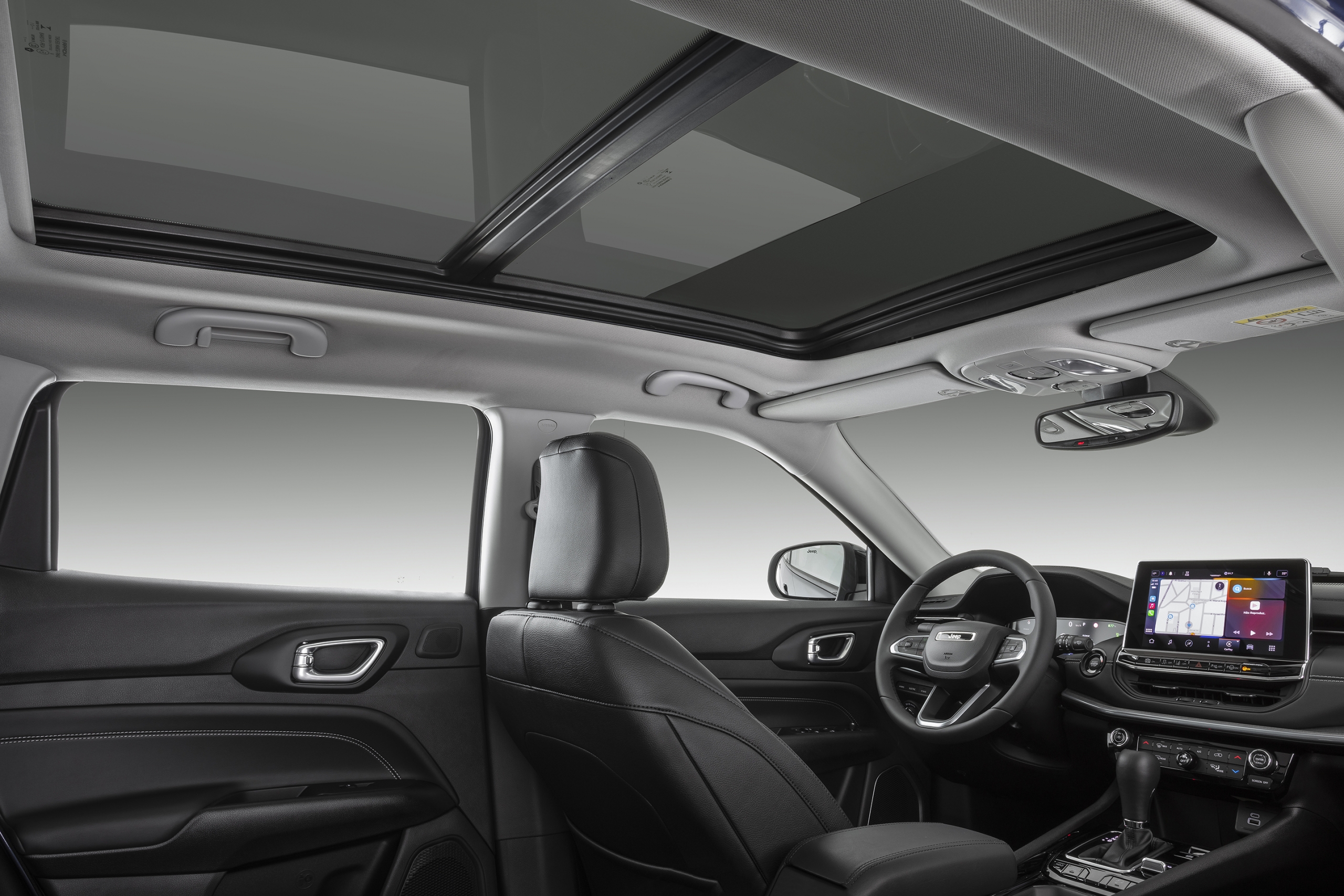 Os opcionais do Compass incluem: teto-solar panorâmico, assistente de estacionamento semiautônomo, sistema de controle de velocidade adaptativo, alerta de mudança de faixa com correção, leitor de placas, alerta de veículo no ponto-cego, frenagem autônoma de emergência e sete airbags.