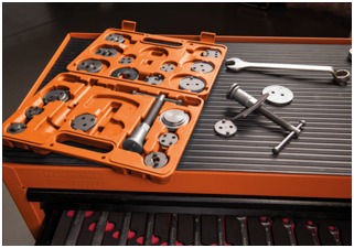 Produzida em aço especial temperado, o kit de ferramentas para retornar êmbolos da pinça de freio possui 22 peças. Seus diferentes perfis permitem utilizar a ferramentas em automóveis nacionais e importados. Os fusos possuem sistema imantado para fixar a ferramenta, além de conter fosso com rosca esquerda e direita com manípulo e encaixe sextavado de 22 mm. Para armazenamento, organização e transporte, o kit acompanha maleta plástica com nichos para encaixar as peças.