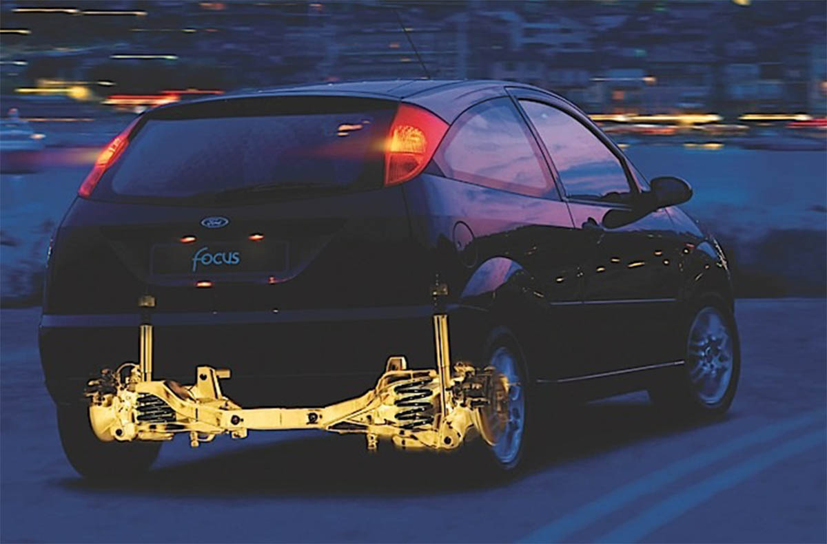A suspensão traseira do Focus compartilha algumas peças com o Mondeo porém recebeu peças mais estruturadas devido a forma de fabricação de suas bandejas em aço estampado.