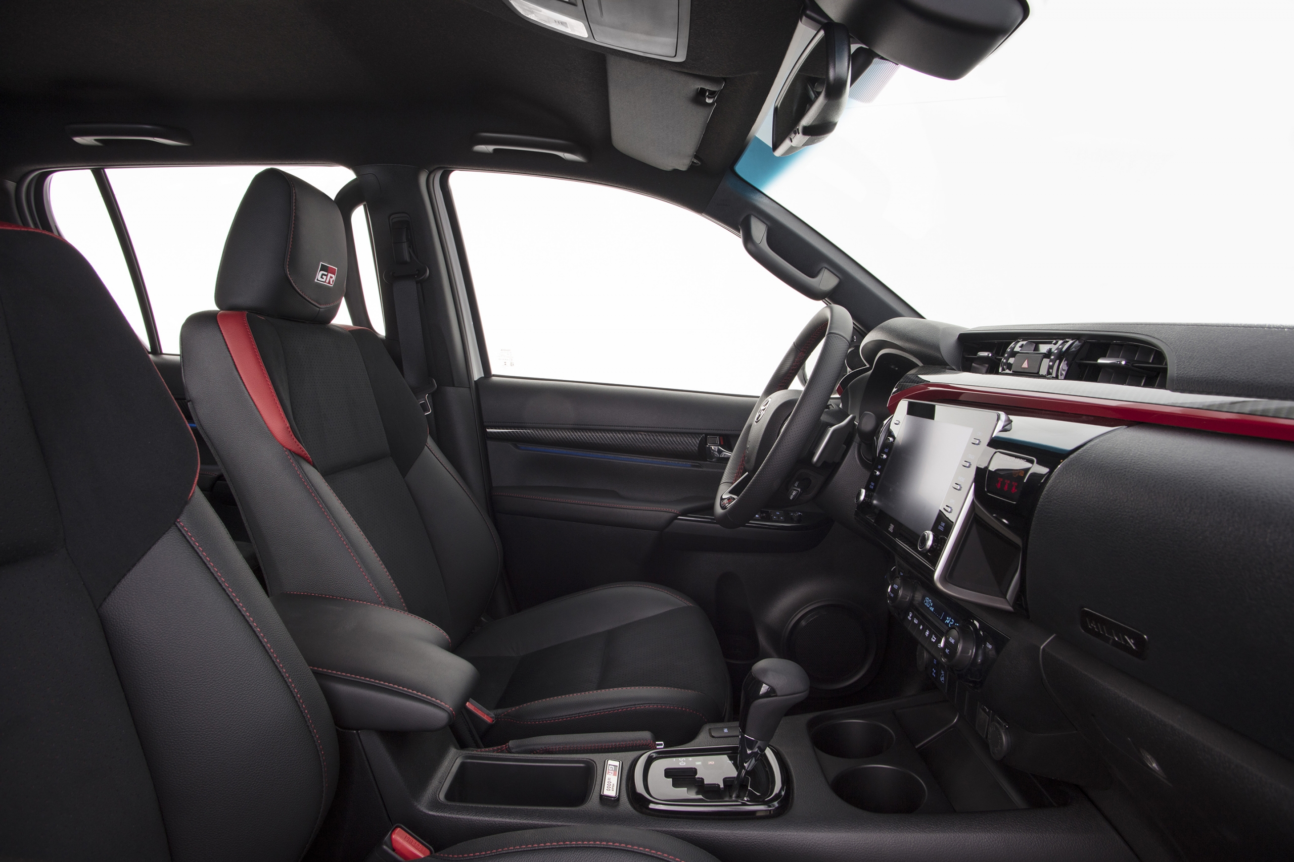 Internamente, a nova Hilux GR-S ganhou bancos dianteiros com acabamento exclusivo que combinam couro natural e ecológico e Suede® perfurado, com costura vermelha e personalização GAZOO Racing. O preço sugerido é de R$ 348.790,00*