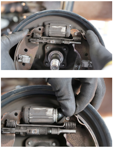 ETAPA 3: inspecione vazamentos ou emperramento dos pistões nos cilindros de roda e se o sangrador não está quebrado ou entupido.